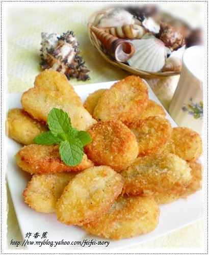 香蕉切塊或切片,沾上麵糊後再裹上麵包粉入油鍋炸至兩面金黃->撒上梅子粉.