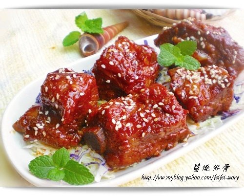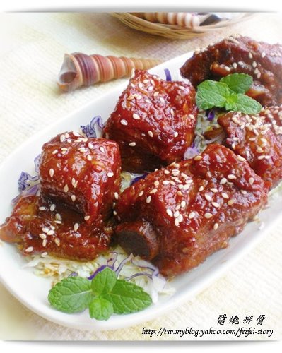 醬燒排骨:1.小排洗淨放至鍋中微煎至兩面金黃.2.加入調味料以大火煮沸後轉中小火熬煮至湯汁收乾,撒上白芝麻粒. 調味料:蒜頭.醬油.酒.糖.黑醋.蕃茄醬.微量的水.