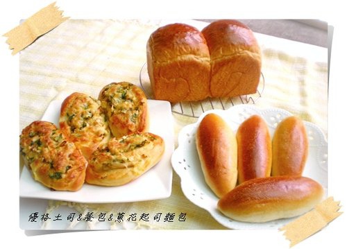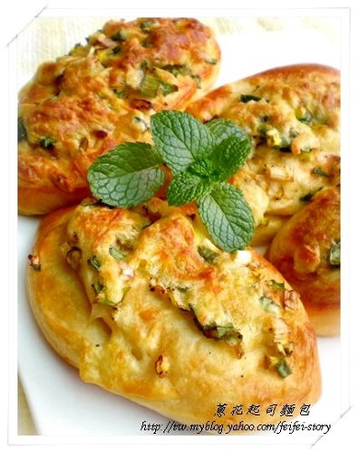 2.入烤箱前抹上蛋液,其中割劃一刀的四個麵包体鋪上蔥花餡料,撒上起司絲->烤箱180/180約15-20分.