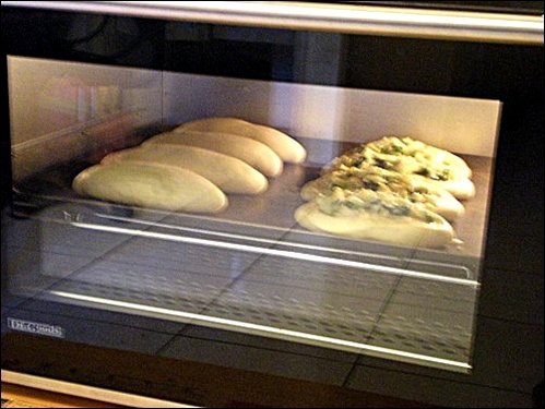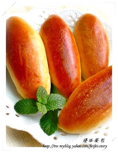 1.麵糰450g分割成8等份->滾圓靜置約15分->橄平翻面->長向捲起->放入烤盤,其中四個麵包体表面深割一刀->全部靜置發酵約40分