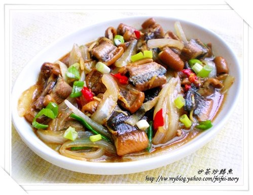 2.鍋中入麻油,爆薑絲.辣椒,倒入鱔魚塊快炒->放洋蔥絲及調味料拌炒->以太白粉水芍芡後,淋上香油,撒蔥末裝飾.