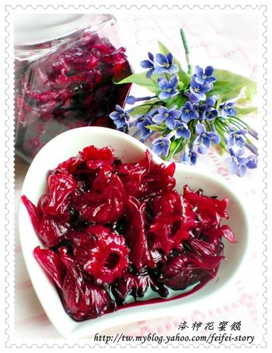 洛神花去籽後,以清水洗淨->入沸水中快速燙過,瀝乾水份->放入消毒過的大玻璃罐中