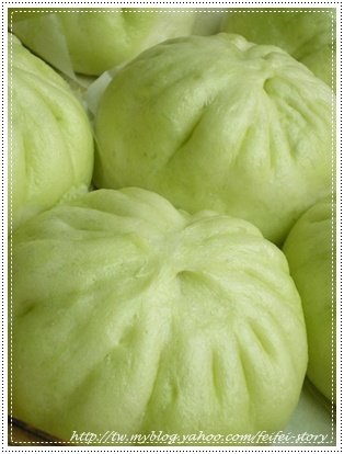 2. 白麵糰與綠麵糰分別滾圓覆膜靜置約20分->各自橄成長片後重疊捲起->分割成12塊.橄成大圓片(外薄中厚)-> 包餡入蒸籠->置於溫水上發酵約40分->中小火約15分蒸熱.