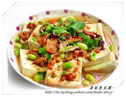 2.鍋中入油爆香蝦米.香菇絲後加上油蔥酥&自製紅麴肉燥(含湯汁)煮沸後倒入盤中,放上燙過的毛豆->淋香油,入電鍋蒸熟.