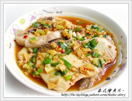 2.原鍋入薑末.辣椒炒香,續放薄塩醬油.糖.泰式甜雞醬.少許水煮開後,撒入蔥花,淋於魚片上.