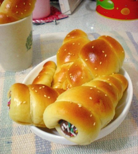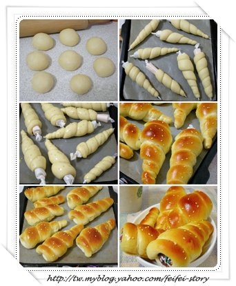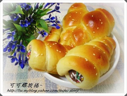 ->離螺旋模尖處約2cm處捲起->發酵30分->塗上蛋液,撒白芝麻