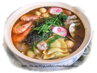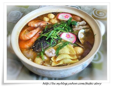 ->加進所有火鍋料煮滾,起鍋前放入青蒜.
