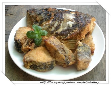 - 魚頭和魚塊洗淨瀝乾後加入醃料醃漬後沾上地瓜粉入油鍋中炸至金黃.
