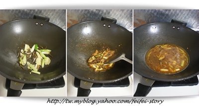 2.炒鍋中放少許油,倒進蒜白.蔥白.薑片.蒜片.扁魚爆香->放沙茶醬.辣豆瓣醬