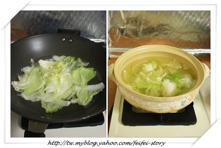 1.砂鍋中倒入海鮮湯汁.香菇水及清水,再放雞湯塊及川燙過的大白菜煮滾.