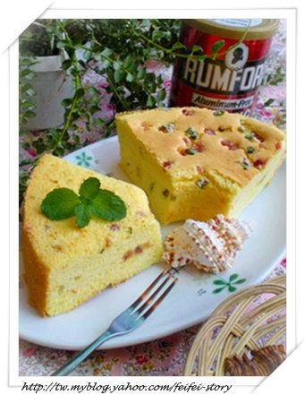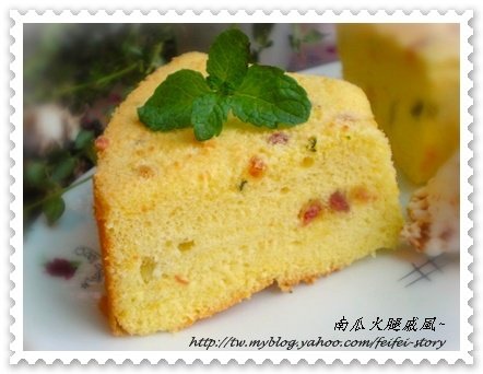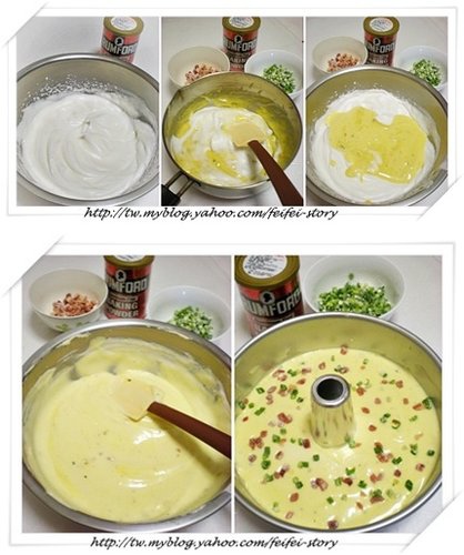 ->再倒入剩下的麵糊,撒入火腿丁及蔥花末