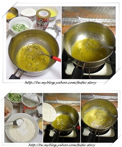 2.倒入已過篩的低筋麵粉及泡打粉拌勻->再入起司粉.