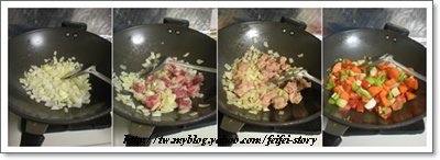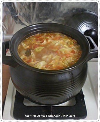2.所有蔬菜丁全入鍋中略炒後,再連高麗菜絲全部放入牛肉湯中->入適量調味料