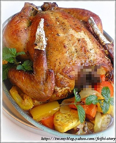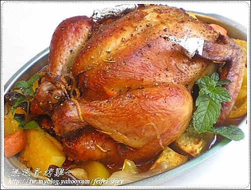 3.以烤箱200度烤約90分,烘烤中把湯汁淋於雞身上,以呈脆皮效果.