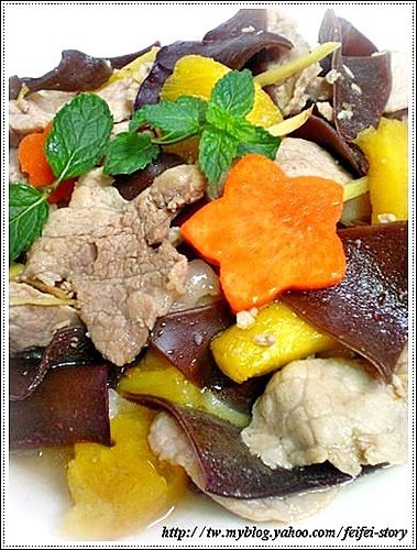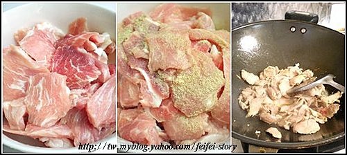 1.豬肉(俗稱老鼠肉)切薄片後加酒.塩.白胡椒粉醃入味.