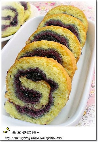 3.抹上桑椹醬捲起入冷藏定型後切片.