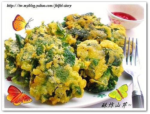 1.山芹菜去除老葉及粗梗->沾裹麵糊->入油鍋炸酥.