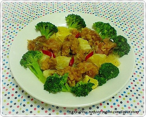 2.放入排骨酥煮至略為收汁再以川燙好的花椰菜裝飾.
