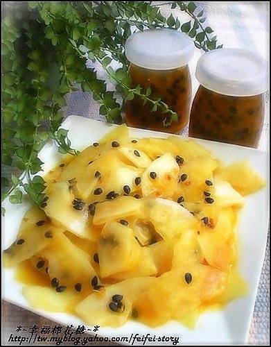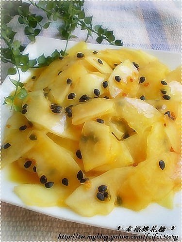 2.以冷開水洗去塩份後擰乾,加入百香果果醬及砂糖拌勻入冰箱冷藏至入味.