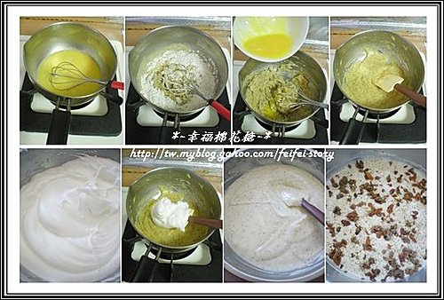 再把打好的蛋白霜分次加入作法2的蛋黃麵糊中拌勻.