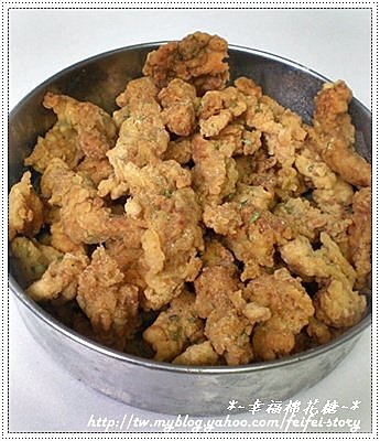 2.沾取麵糊後再裹上一層高筋麵粉入油鍋中炸至金黃.