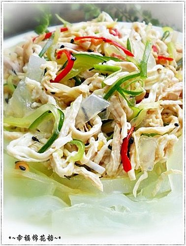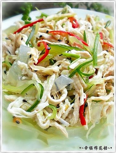 1.雞胸肉抹塩略醃後,入鍋中煮熟後剝絲備用