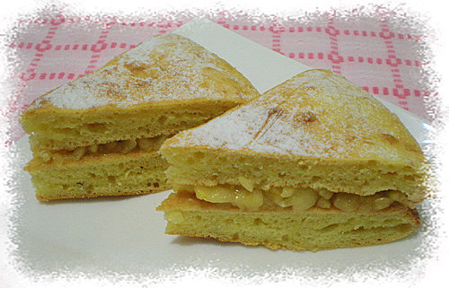 把蘋果餡料舖在烤好的蛋糕皮上~(vicky做了兩個蛋糕皮)